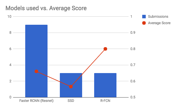 - Most of our contestants used Faster RCNN for their model, which gave a variety of scores ranging from 0.5 to 0.77. But our clear winner was Deformable R-FCN with an average score of 0.8