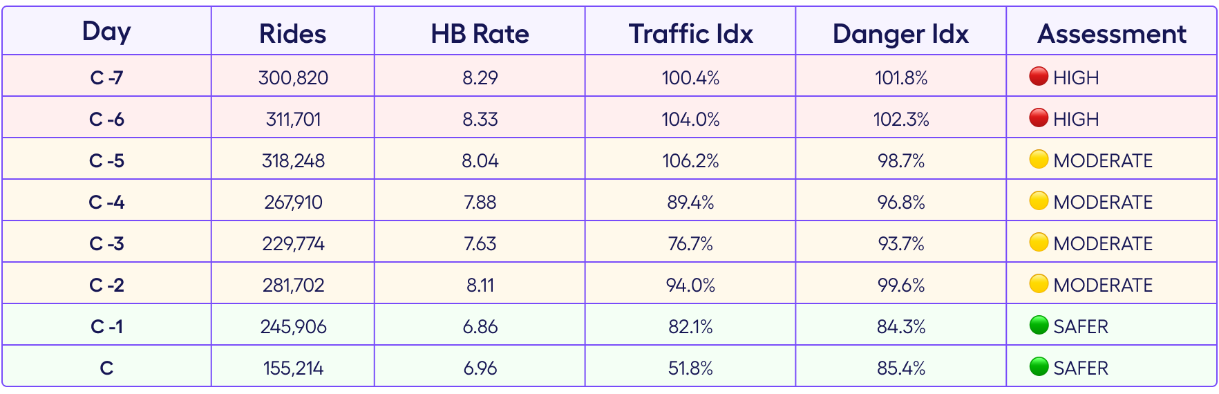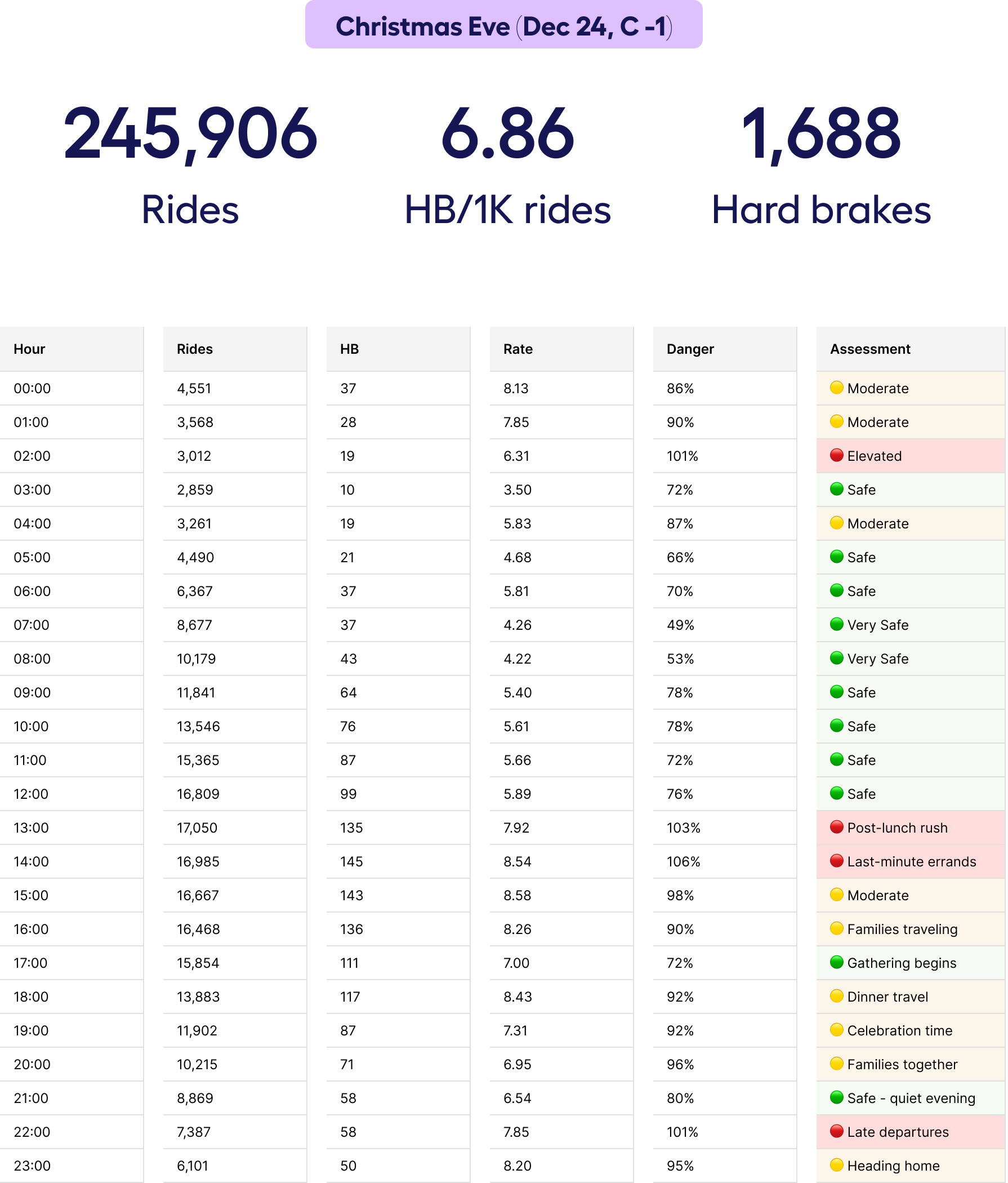 🔴 Pre-holiday week (C-7, C-6): Peak danger - busy shopping with above-normal hard brake rates