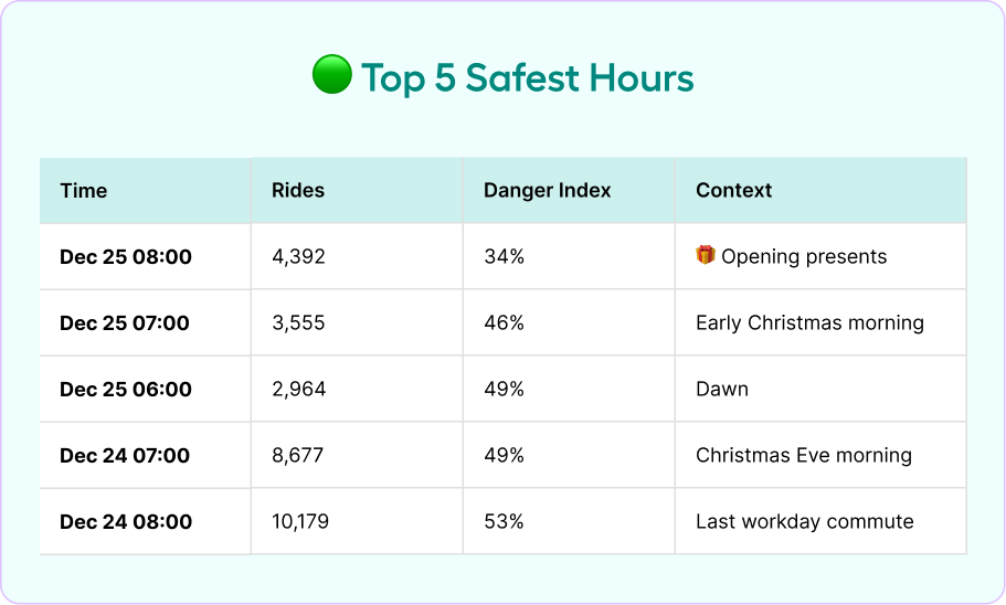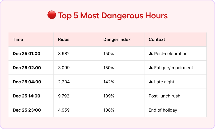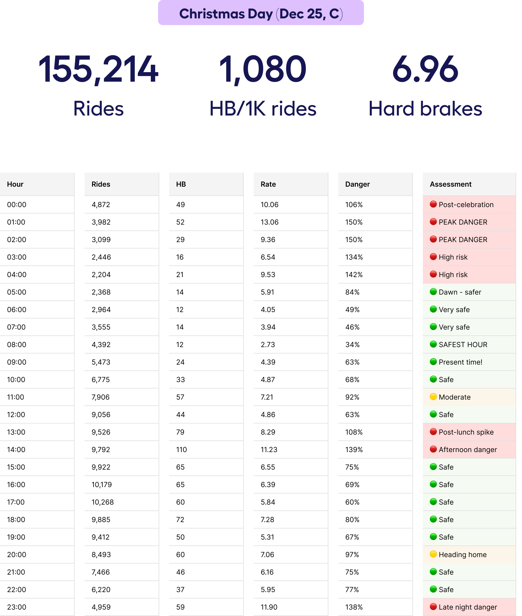 Christmas Eve evening (17:00-21:00) is surprisingly safe as families gather. Post-midnight Dec 25 (00:00-04:00) is extremely dangerous with danger indices up to 150%.